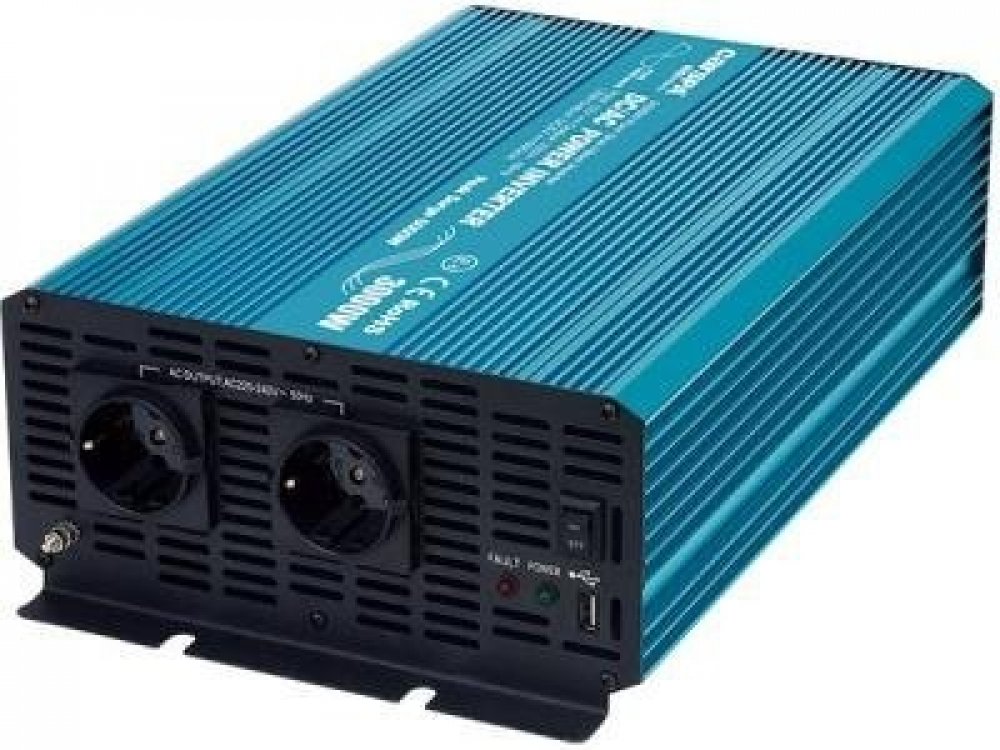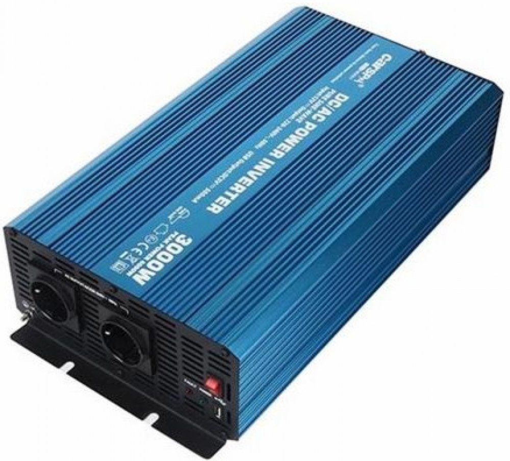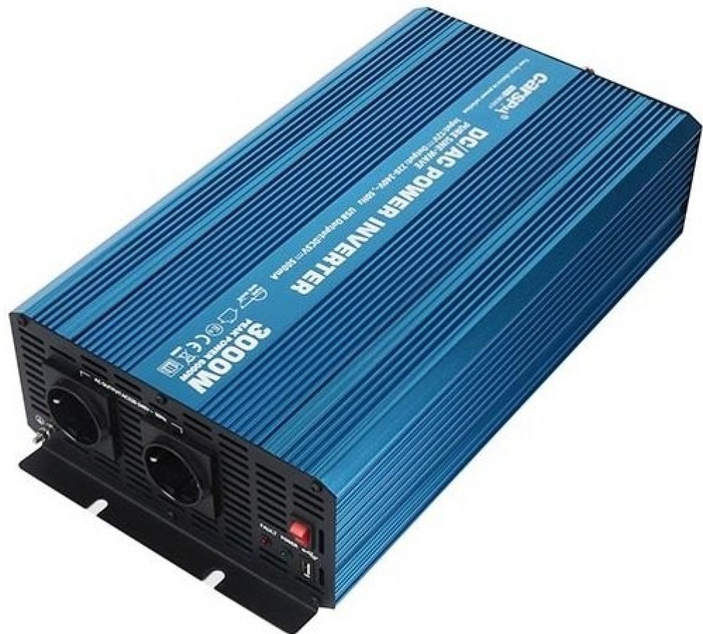 Napěťový měnič Carspa P3000U-122 12V/230V+USB 3000W, čistá sinusovka Napěťový měnič CARSPA P3000U-122 nabízí vynikající kvalitu a skutečný sinusový výstup pro provoz vašeho oblíbeného elektrického nářadí a jiných citlivých zatížení. Měnič disponuje vysokou odolností proti rázovému proudu a schopností spustit těžké zátěže jako například televizory, motory a další. Chladicí ventilátor v měniči je te...
