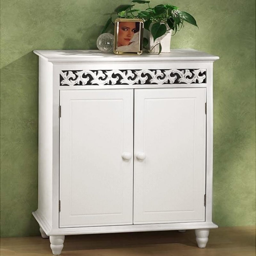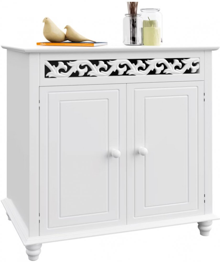 Pěkná komoda s množstvím prostoru! Tato propracovaná komoda Jersey ve venkovském stylu podmaňuje svou osobitou dřevěnou výzdobou a příbytku dodává starožitný nádech. Rozměry (v x š x h) 76 x 65 x 35 cm nabízí skříňka na dvou policích dostatek místa na uskladnění všeho druhu. Díky odnímatelné polici vzniká možnost odložit i větší věci. Originální kousek nábytku , který se dá výborně kombinovat is jinými styly zařízení. Skutečná ozdoba! Přednosti výrobku: pevná konstrukce pevná členící police dekorativní dřevěná výzdoba venkovský styl, starožitný v bílém 2 křídlové dveře včetně knoflíkových úchytek & magnety stabilní nohy z dřevěného masivu rychlá a jednoduchá montáž Technické údaje: rozměry: (v x š x h) 76 x 65 x 35 cm rozměry dveře: (v x š) 53 x 29 cm materiál: MDF barva: bílá Obsah zásilky: 1 x komoda s 2 dveřmi včetně úchytek 1 x vkládací police montážní materiál návod k montáži dodávka bez dekorace