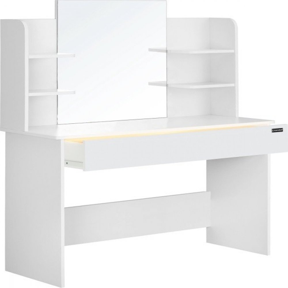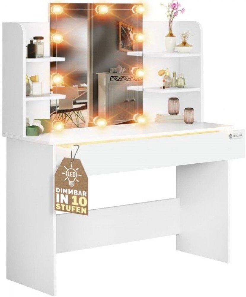 Toaletní stolek LUCIA s osvětlením je ideální volbou pro ty, kteří hledají spojení elegance a funkčnosti. Tento vysoce značky JURHAN® zaujme svým jednoduchým a nadčasovým designem, který se hodí do každé ložnice či šatny. S rozměry 108x40x140 cm poskytuje dostatek prostoru nejen na kosmetické doplňky, ale také na další osobní věci. Jedním z hlavních benefitů tohoto toaletního stolku je velká zásuvka, která o objemu 50 l je rozdělena na 3 praktické přihrádky, což zaručuje dokonalý přehled a uspořádání vašich věcí. Osvětlení zásuvky se automaticky aktivuje pomocí snímače vzdálenosti při jejím vysunutí, a dalších 10 LED světel zajistí ideální osvětlení s možností stmívání v 10 krocích a výběru z 3 různých světelných režimů (teplá bílá, přírodní bílá, bílá). Kromě toho máte k dispozici 4 police, na které si můžete vystavit parfémy či kosmetiku. Zrcadlo o rozměrech 64,5 x 57 cm, vybavené integrovaným LED osvětlením, usnadňuje přípravu na váš den. Díky odolnému povrchu z MDF je údržba stolku velmi snadná, což se pozitivně odráží na jeho dlouhé životnosti. K ochraně vaší podlahy jsou k dispozici praktické chrániče. Montážní návod je součástí balení, které se skládá ze 2 kusů. Produkt je dodáván v pečlivě zabalených balících s rozměry 120x47x11 cm a 77x62x10 cm, přičemž celková hmotnost činí 35,5 kg. Toaletní stolek LUCIA je skvělou volbou pro každého, kdo ocení kvalitu, funkčnost a moderní design.