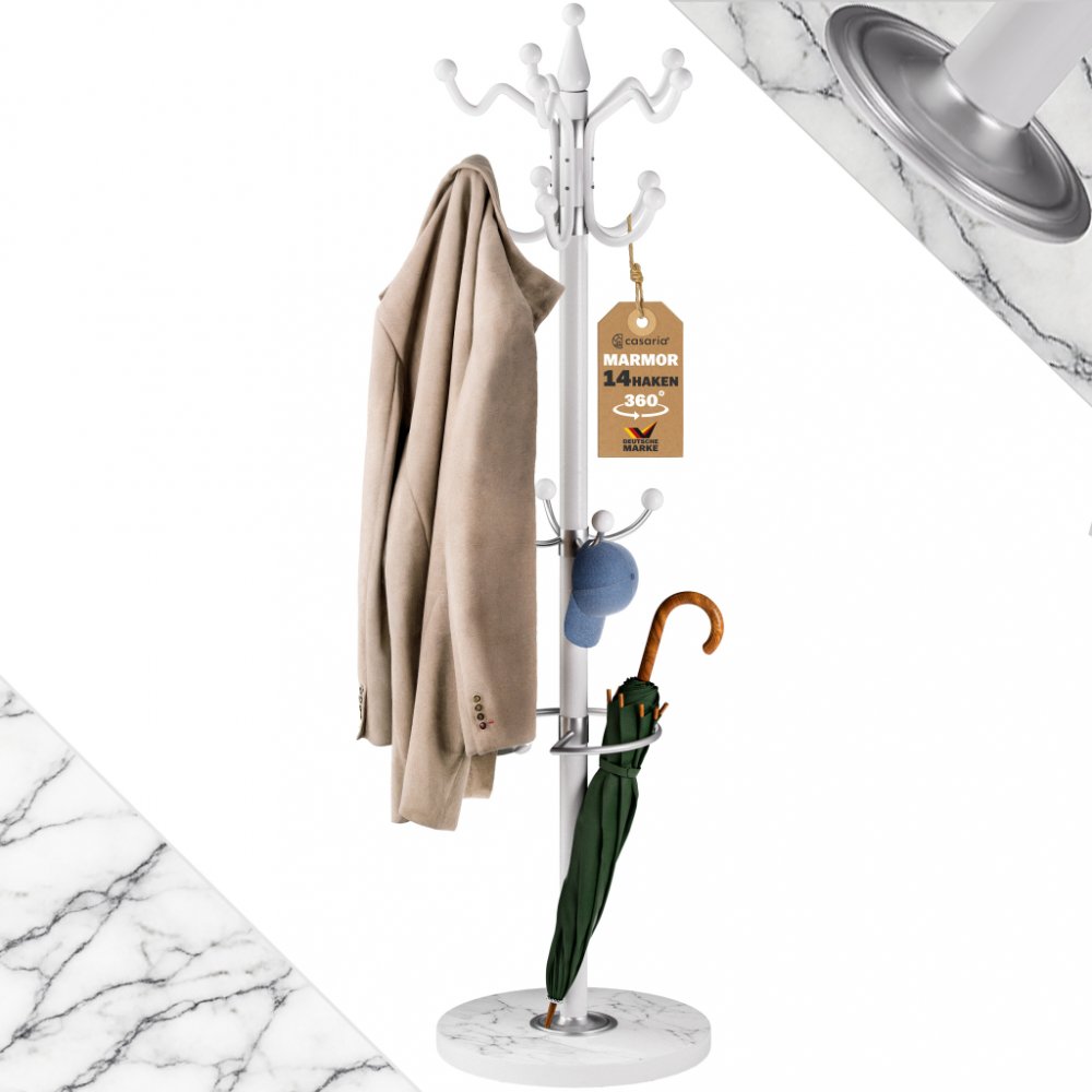Klobouk dolů! Zakřivený věšák s mramorovým podstavcemSTYLOVÝ A PROSTOROVĚ ÚSPORNÝ Věšák na kabáty CASARIA® s kompaktním designem optimálně využívá prostor v předsíni, kanceláři nebo malých místnostech. čtrnáct háčků ve třech úrovních nabízí dostatek úložného prostoru pro bundy, kabáty nebo klobouky. Skříň doplňuje stojan na deštníky.SNADNO PŘÍSTUPNÉ HÁČKY Horní pětiramenný kruh má 10 zakřivených h...
