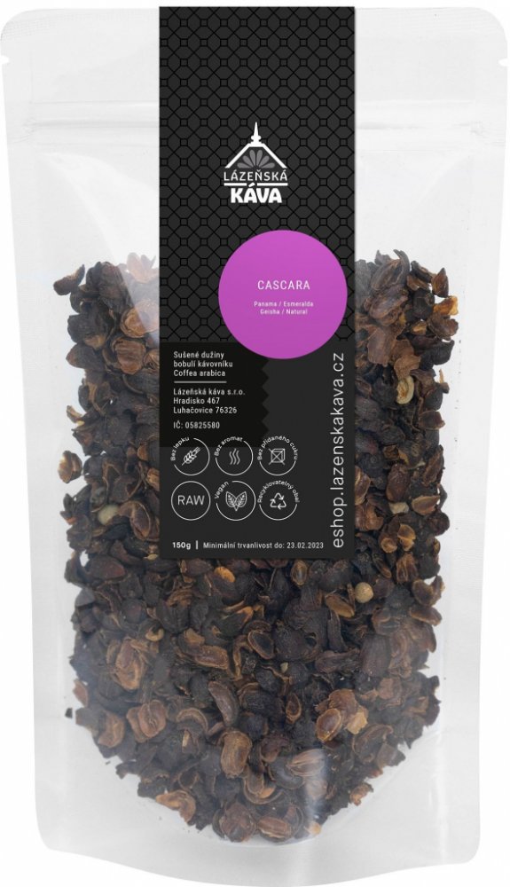 Naturálně zpracované plody kávovníku Geisha. Kávové třešně byly na farmě pečlivě přebrány a na slunci sušeny. Slupkami těchto kávových bobulí je tato Cascara pro přípravu čaje a dalších nápojů podmanivé chuti.