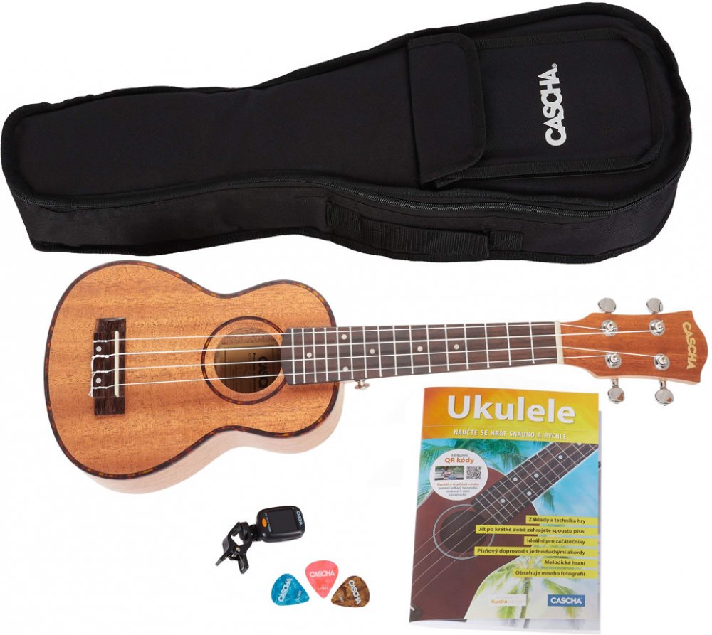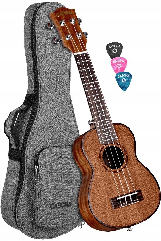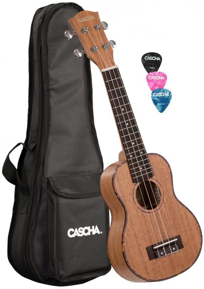 Akustické ukulele Sopránové ukulele Cascha s označením Premium je cenově dostupný nástroj, který potěší děti i dospělé. Spolu s ukulele získáte i praktický polstrovaný obal (tloušťka polstrování 5 mm) a tři trsátka, takže můžete okamžitě vyrazit za zábavou k vodě, do skal, k moři… všude, kde to žije. Tělo ukulele je zhotoveno z mahagonu. Plochu palisandrového hmatníku rozděluje šestnáct pražců (ze stejného materiálu je zhotovena i kobylka). Struny jsou uchyceny v chromovaných ladících mechanikách kytarového typu. Pěkné zpracování podtrhuje rozeta a oboustranná obvodová lemovka těla z imitace želvoviny. Značka Cascha nabízí široké spektrum hudebních nástrojů s jedním společným jmenovatelem a tím je cenová dostupnost. Cíleně tak míří na potřeby začínajících muzikantů, kterým poskytuje kompletní servis.