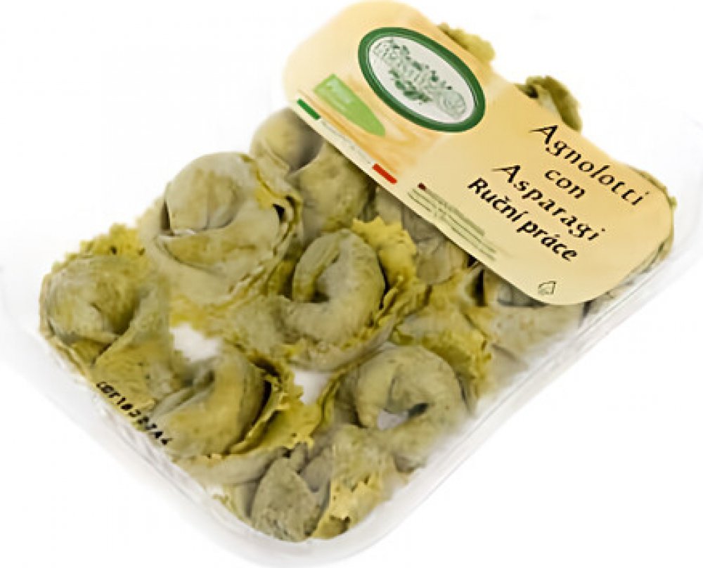 -- Agnolotti jsou druh plněných těstovin, typický pro oblast Piemont v Itálii. V tomto případě jsou malé kousky čtvercového těsta naplněné chřestem. Buon Appetito!