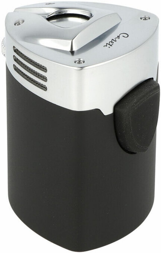 Stolný zapaľovač Caseti Triple Jet Black je výbornou voľbou pre milovníkov cigár. Tento elegantný model zaujme kombináciou matnej čiernej farby a pololesklého chrómu, ktorá mu dodáva luxusný vzhľad.