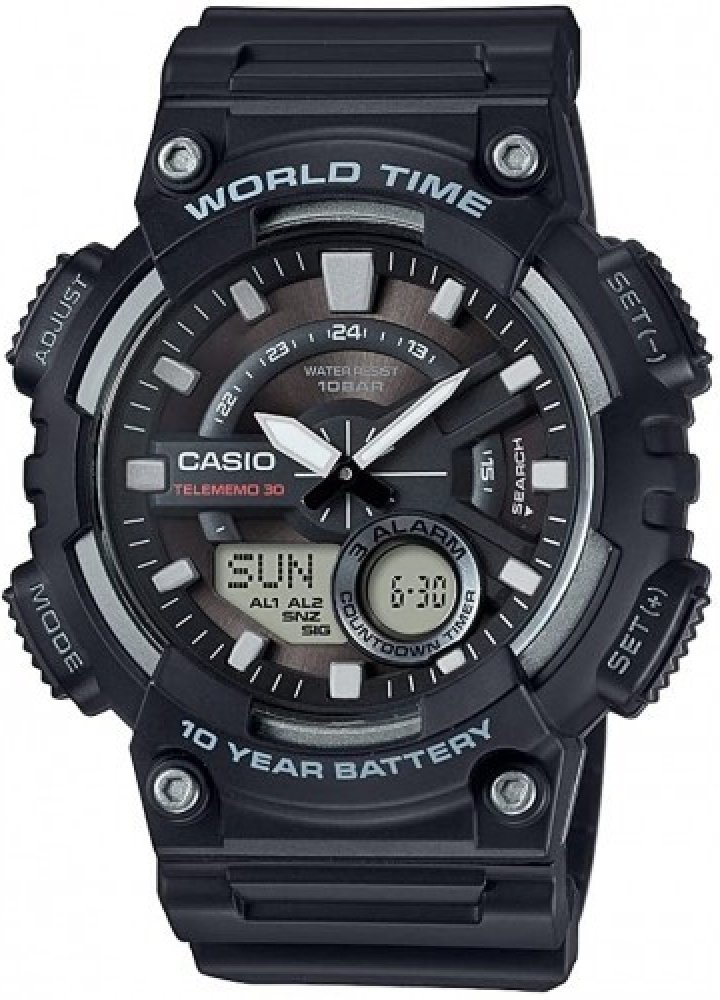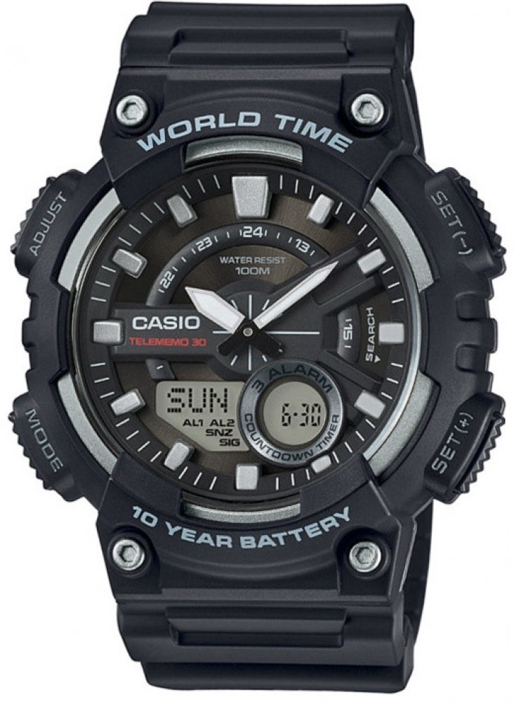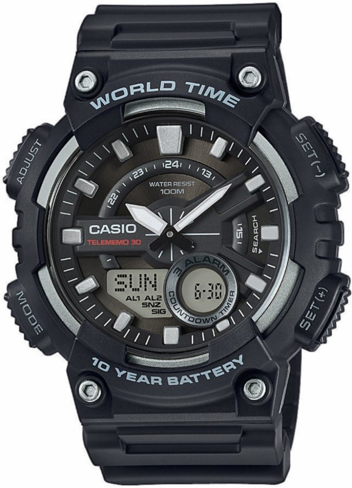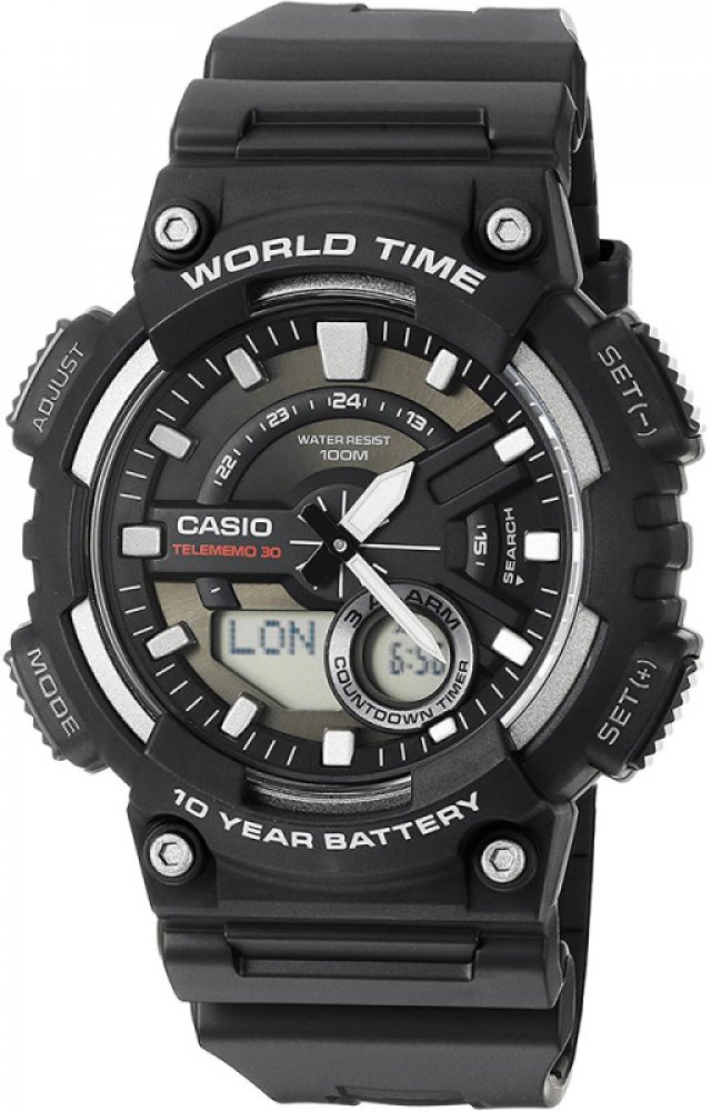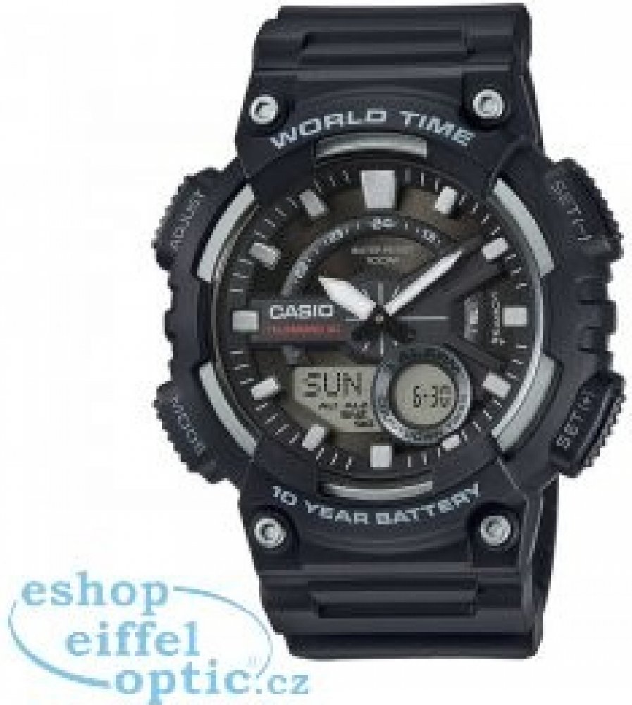 Masivní hodinky Casio AEQ 110W-1A určeny pro muže. Hodinky mají plastový pásek a pouzdro ve tvaru kruhu. Hodinky disponují kombinovaným ciferníkem a řadou špičkových funkcí, jako např. datumovka, databanka, stopky, světové časy, LED osvětlení displeje. Tyto hodinky jsou skvělým doplňkem každého muže.
