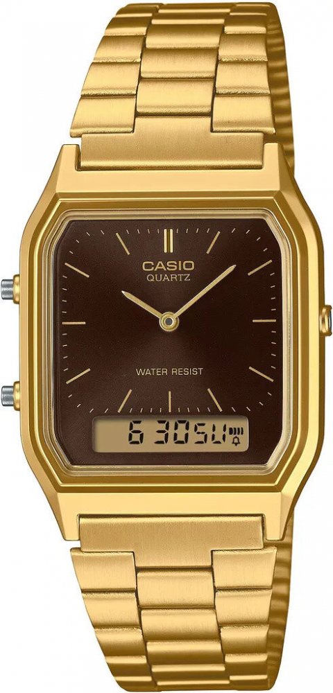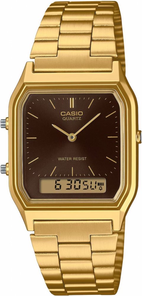 RETRO pánské kombinované hodinky CASIO AQ-230GA-5AMQYES jsou vyrobeny z plastu v kombinaci s kovovým řemínkem ve zlacené úpravě v barvě žlutého zlata. Hodinky nabízí spoustu funkcí: stopky, odpočet, budík, hodinový signál.