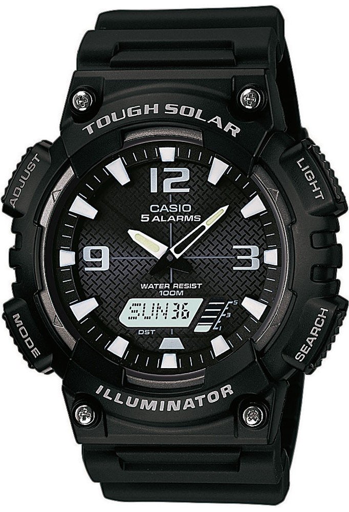 Pánské kombinované hodinky CASIO AQ S810W-1A mají pouzdro i řemínek vyrobeno z plastu. Hodinky jsou napájeny formou solární energie, není potřeba měnit běžnou baterii. Model nabízí několik pokročilých funkcí: kontrolu stavu akumulátoru, alarm, stopky, LED osvětlení, kalendář. Nechybí ani světové časy a odpočet času.
