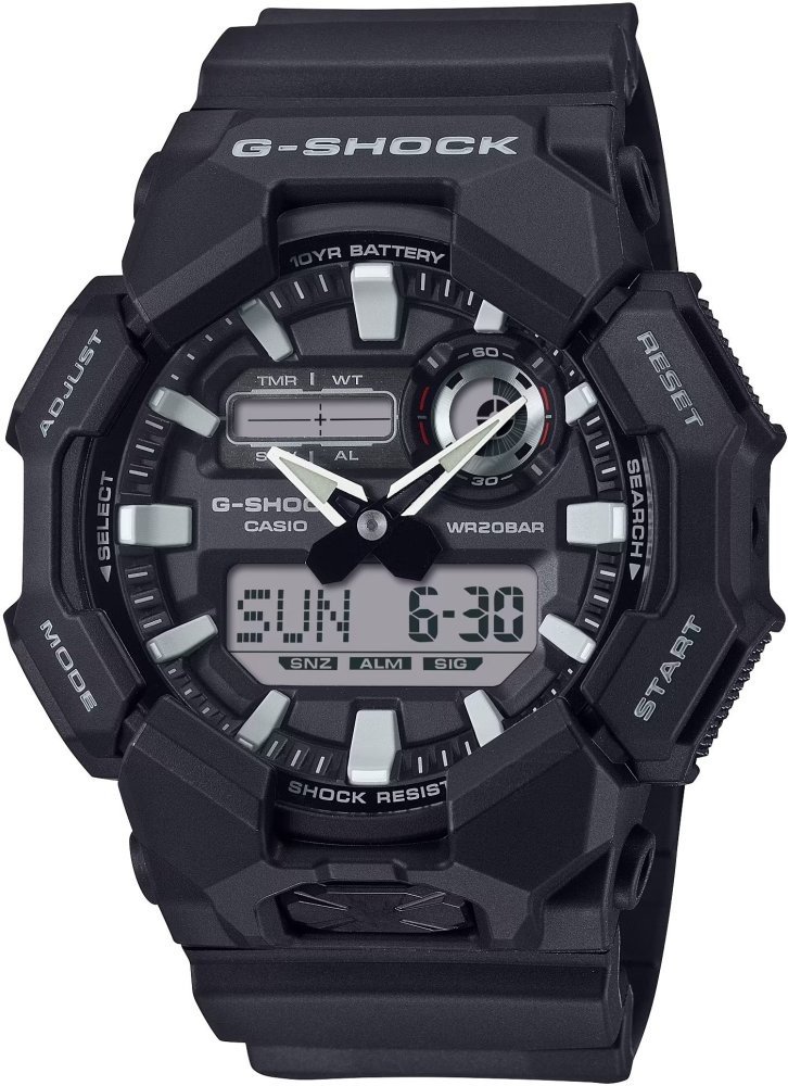 Model GA-010-1A zaujme svým odolným designem s velkým pouzdrem a sportovním vzhledem. Díky konstrukci Carbon Core Guard je lehký, ale zároveň mimořádně odolný. Kombinace analogových ručiček a digitálního displeje přináší přehlednost a univerzálnost. Hodinky jsou skvělou volbou pro sport, outdoor i každodenní nošení a bez problémů zvládnou i náročné prostředí. Díky vodotěsnosti 200 m a odolnosti vůči nárazům patří mezi nejspolehlivější modely v řadě G-Shock.