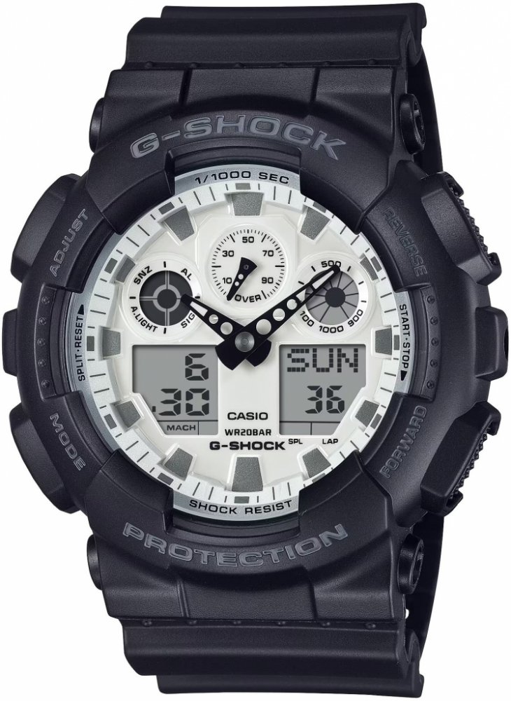 Casio kombinované plast sportovní pánské bateriové - quartz pro potápění (100+ m) 51.2 mm polymer 200 m bateriové 72 g minerální bez osazení G-CLASSIC kulaté černá bílá s LED diodou na přezku na ruku bez číslic 5.12 cm velké max. 100 hodin chodu s přesností 1/1000 sekundy 16.9 mm s dočasným svícením (luminiscence/LED) s nenáročnou údržbou (quartz)