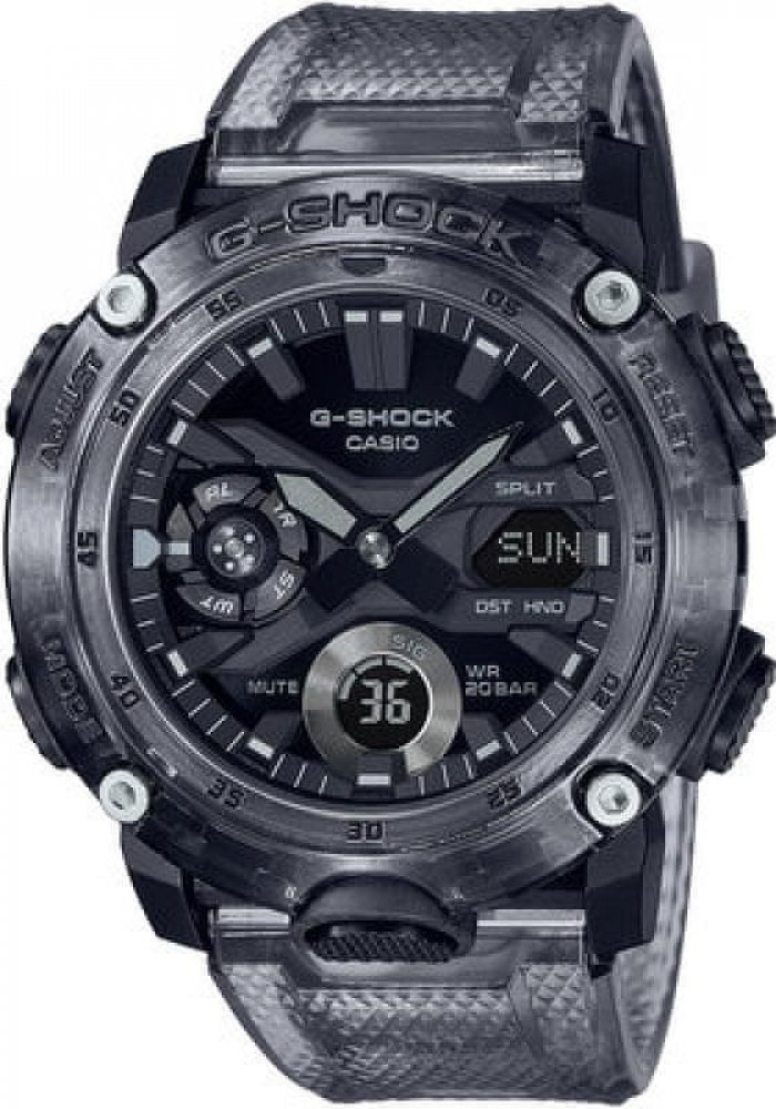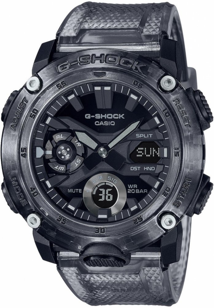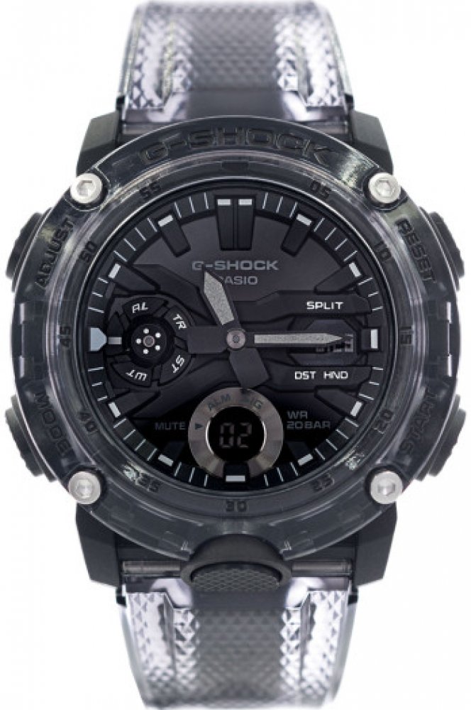 Casio kombinované pryž sportovní pánské bateriové - quartz pro potápění (100+ m) 48.7 mm tvrzený polymer 200 m bateriové 65.0 g minerální bez osazení G-Shock kulaté transparentní černá s LED diodou na přezku 2.6 cm na ruku bez číslic 4.87 cm velké s dočasným svícením (luminiscence/LED) s nenáročnou údržbou (quartz) bez chytrých funkcí