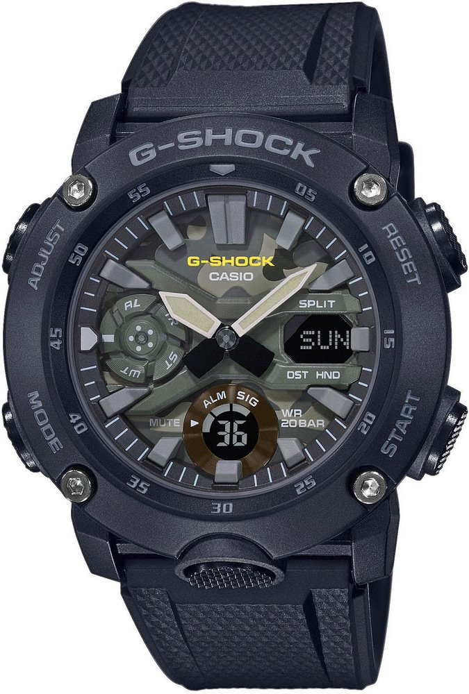 Casio kombinované pryž pryskyřice 200 m bateriové 65.0 g minerální sportovní pánské bateriové - quartz G-CLASSIC kulaté černá vícebarevná trnová spona pro potápění (100+ m) s dočasným svícením (luminiscence/LED) s nenáročnou údržbou (quartz) bez chytrých funkcí na ruku maskáčové bez číslic 5.0 cm velké 50.0 mm s LED diodou
