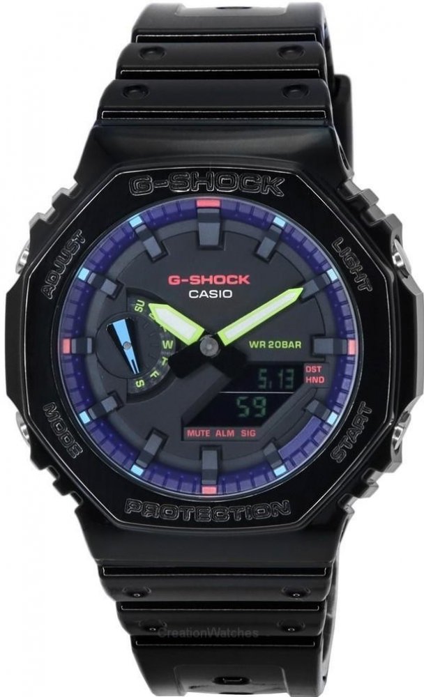 Podrobnosti o produktu GA-2100RGB-1AER Tato řada Virtual Rainbow je inspirovaná virtuálním světem videoher. Pouzdro a řemínek je v lesklé černé barvě a na ciferníku najdete duhový efekt.