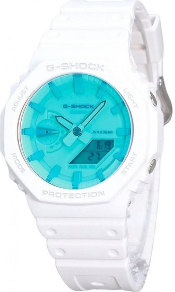 Casio kombinované plast sportovní pánské bateriové - quartz pro potápění (100+ m) 45.4 mm polymer 200 m bateriové 51 g minerální 21 cm bez osazení G-Shock osmihranné bílá vícebarevná s LED diodou 1.8 cm na ruku bez číslic pevná 11.8 mm s nenáročnou údržbou (quartz) bez chytrých funkcí