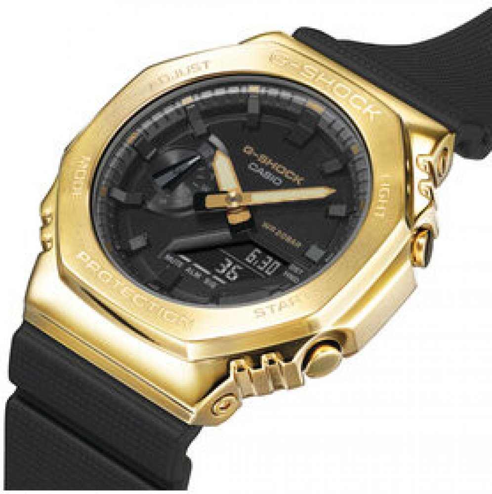 Podrobnosti o produktu GM-2100G-1A9ER Oblékněte se do kovu s G-SHOCK ve stále oblíbeném barevném provedení černé a zlaté. Rám z nerezové oceli je s PVD zlacením ve zlaté barvě. Tento módní návrh s luxusním pocitem a cool vzhledem vás zavede tam, kam chcete. Voděodolnost 200M s funkcemi jako světový čas, stopky a časovač.
