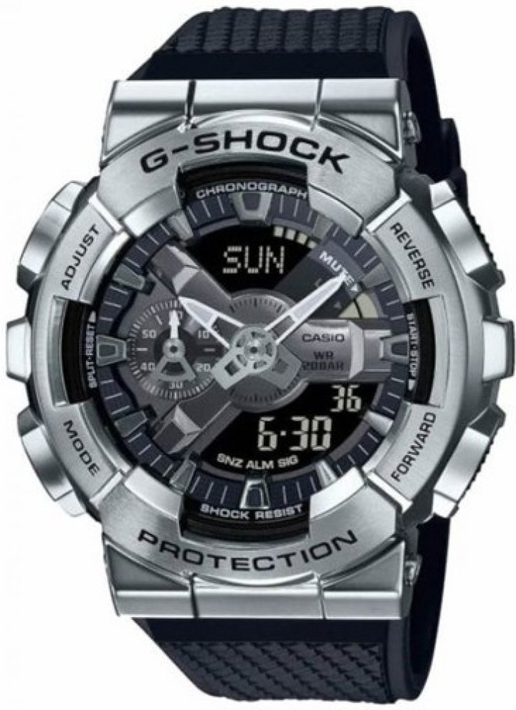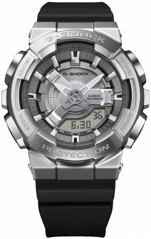 Unisex hodinky CASIO G-Shock GM-S110-1AER zaujmou svým vysoce moderním designem. Na stříbřitém číselníku s šedým okrajem jsou umístěny luminiscenční ručky a plastické indexy. Díky kombinaci analogového a digitálního zobrazení je k dispozici mnoho praktických funkcí jako automatické datum, den v týdnu a měsíc, pětinásobný budík, stopky s časovačem a mezičasem, letní čas, světové časy a časová pásma...