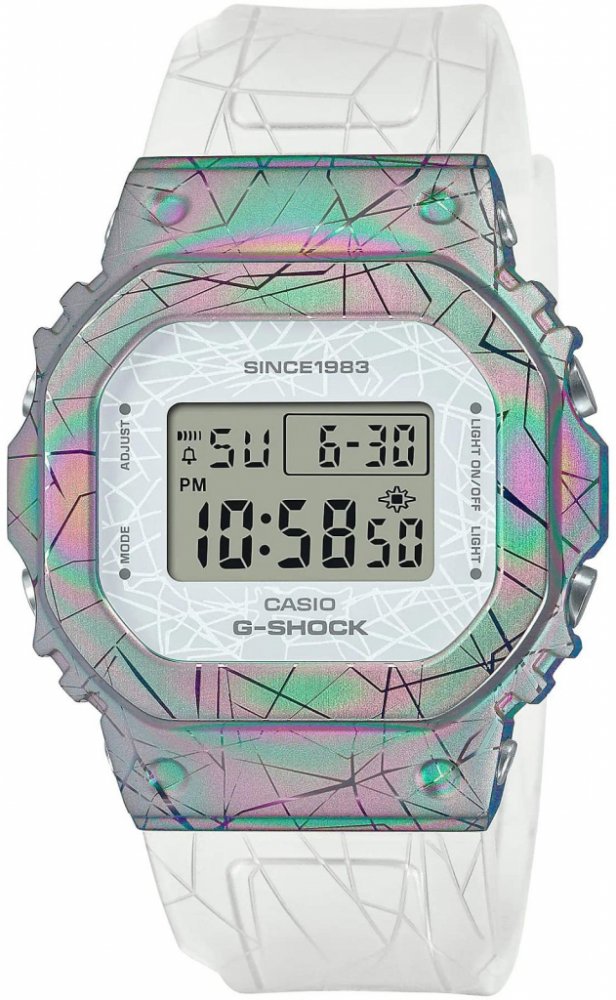 Casio digitální plast sportovní dámské bateriové - quartz 38.4 mm kov 200 m bateriové 50 g minerální bez osazení G-Shock hranaté transparentní bílá s LED diodou na přezku 3.84 cm na ruku s geometrickým vzorem 12.9 mm s dočasným svícením (luminiscence/LED) s nenáročnou údržbou (quartz)
