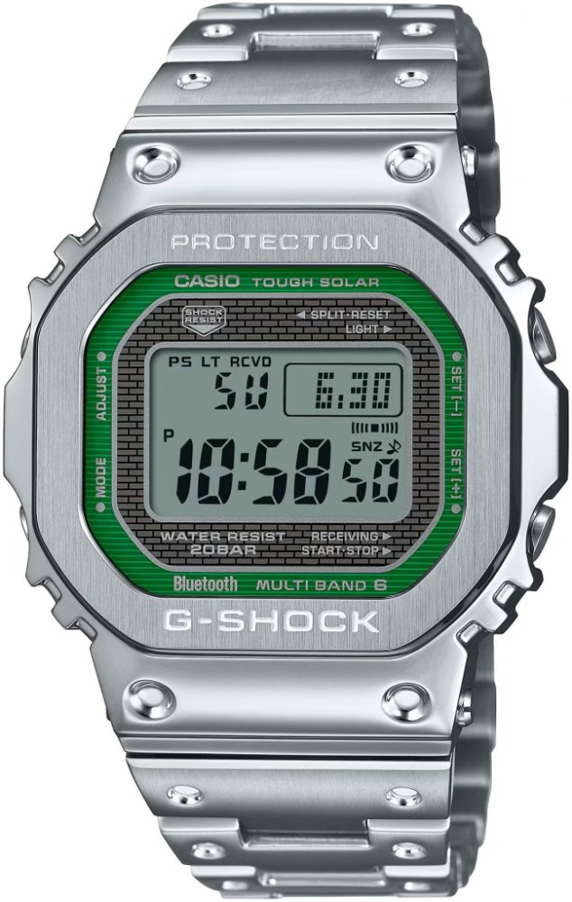 Casio digitální ocel ocel 200 m solární 167 g minerální sportovní pánské solární bez osazení G-Shock hranaté stříbrná vícebarevná sklapovací přezka pro potápění (100+ m) s dočasným svícením (luminiscence/LED) s připojením k telefonu (Bluetooth/GPS) na ruku s arabskými číslicemi stříbrná ocel pevná ocel 13 mm 43.2 mm s LED diodou