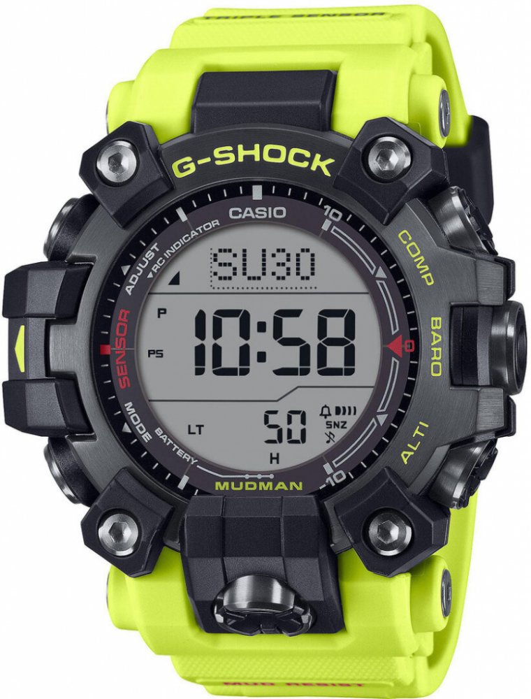 Casio digitální plast sportovní pánské solární pryskyřice 200 m solární 88 g minerální bez osazení Mudman kulaté žlutá šedá s LED diodou trnová spona na ruku s arabskými číslicemi velké pevná s dočasným svícením (luminiscence/LED) se senzory bez telefonu