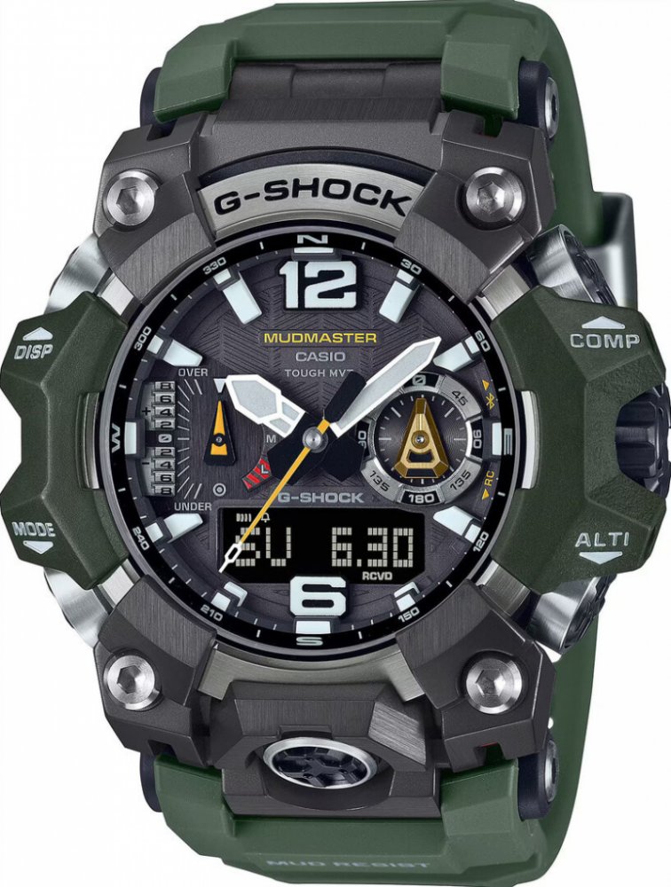 Casio kombinované pryž sportovní pánské solární 52.1 mm pryskyřice 58.7 x 52.1 x 16.2 mm 200 m solární 114 g safírové 21 cm bez osazení Mudmaster kulaté zelená černá s LED diodou trnová spona 2.4 cm na ruku s arabskými číslicemi stříbrná ocel 16.2 mm s připojením k telefonu (Bluetooth/GPS)
