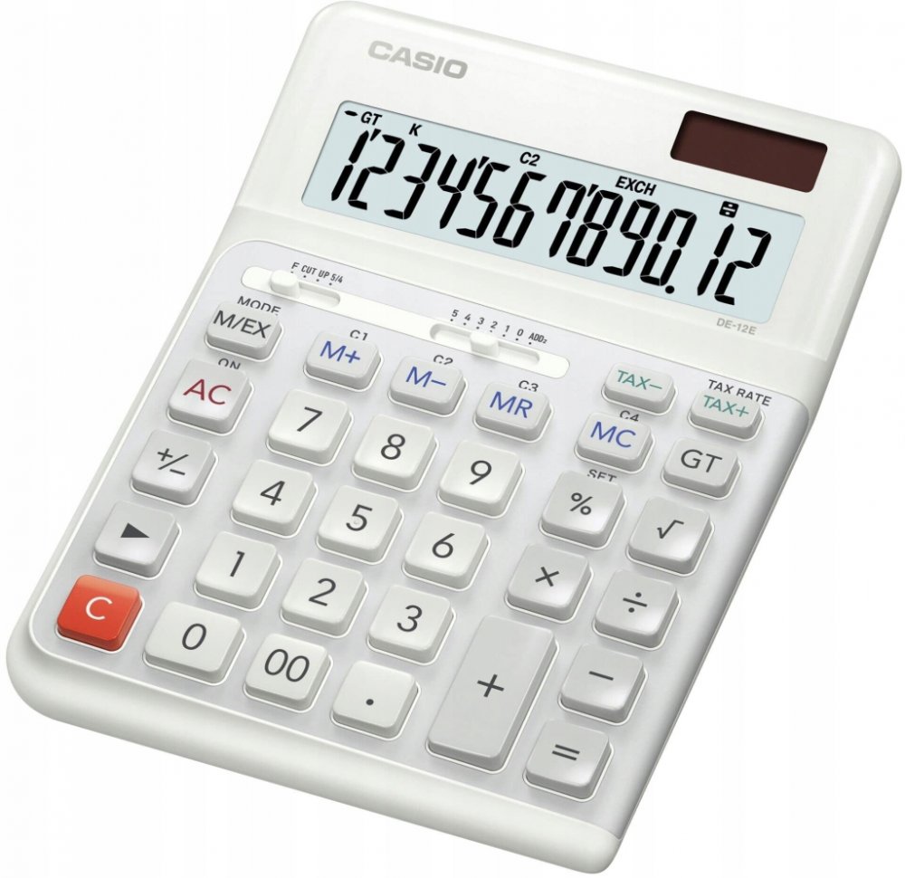 - punkt : CASIO DE-12E WE 12místná ergonomická stolní kalkulačka s dobrou kvalitou, ergonomická kalkulačka pro praváky, převod měn se 3 úložnými kurzy, možnosti zaokrouhlení, volitelné zaokrouhlení na 0/1/2/3/4 číslice nebo blízko nich, klávesa Backspace, mazání posledních číslic ze zadaných hodnot a sudých výsledků