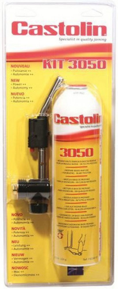 Castolin Hořák pro tvrdé pájení s Piezo zapalováním v setu KIT 3050 v setu s kartuši 7/16" 250 gr / 410 ml (číslo 730240 XP). Hořák lze používat ve všech polohách 360° (je nutno používat kompatibilní kartuše 3050 nebo alternativní z důvodu funkce 360° a výhřevnosti plynu).