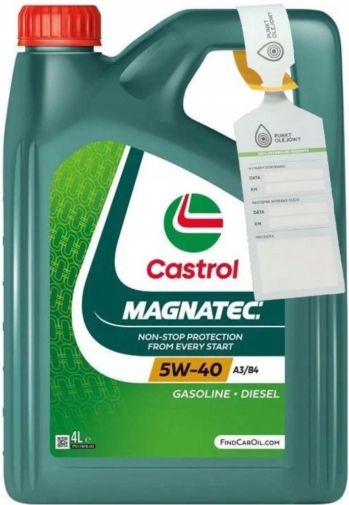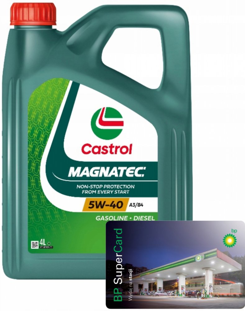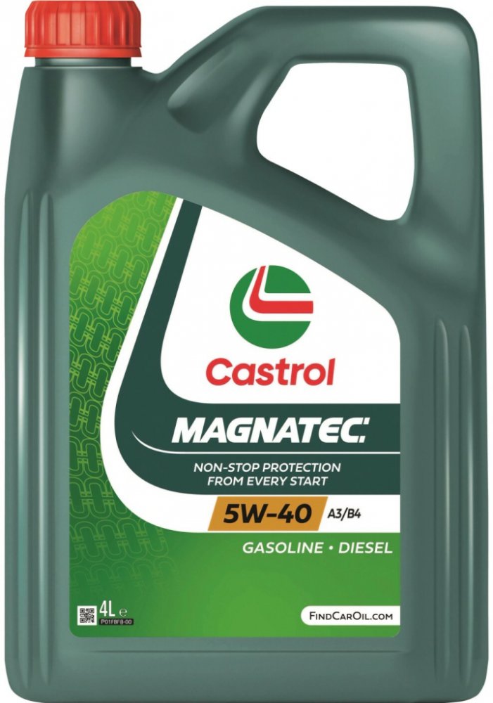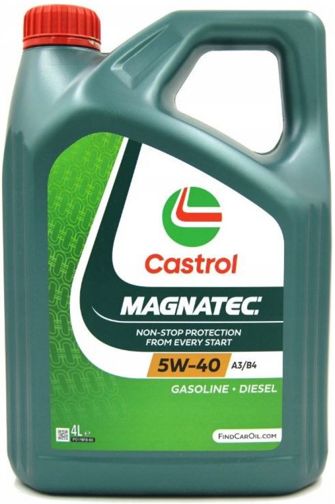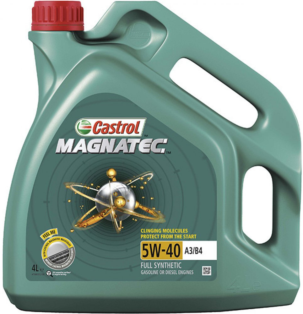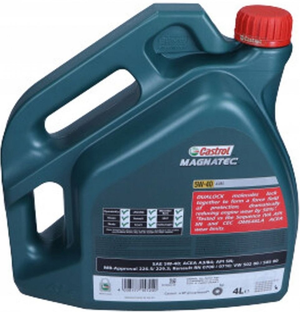 Až 75 % opotřebení motoru vzniká při jeho zahřívání na provozní teplotu. Když motor zastaví, běžný olej steče z kritických částí motoru, avšak olej Castrol Magnatec nikoliv. Inteligentní molekuly tohoto oleje totiž přilnou k součástkám motoru a vytváří tak ochranný mazací film, který je připraven chránit motor od okamžiku nastartování.Inteligentní molekuly oleje Castrol Magnatec ulpívají na součástkách motoru jako magnet a tím výrazně snižují* opotřebení.Je vhodný pro použití v benzinových a dieselových motorech osobních automobilů, kde výrobce doporučuje olej viskozitní třídy SAE 5W-40 a specifikace ACEA A3/B4, A3/B3, API SN/CF anebo dřívější specifikace. Je schválen pro použití v široké škále vozů dle schválených specifikací. Pro správnou aplikaci nahlédněte do uživatelské příručky Vašeho vozu.Inteligentní molekuly oleje Castrol Magnatec:ulpívají na kritických částech motoru.vytvářejí ochranný mazací film, který chrání motor vůči opotřebení během startu a po něm.přilnou ke kovovým povrchům a tím je chrání vůči opotřebení.poskytují průběžnou ochranu motoru za všech jízdních podmínek, stylů jízdy a teplot.Castrol Magnatec 5W-40 A3/B4 poskytuje vynikající výkonnost i při extrémně nízkých teplotách.