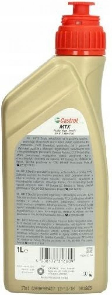 Výhody:Castrol MTX Fully Synthetic 75W-140 nabízí následující výhody:- zajišťuje mimořádnou ochranu v extrémních pracovních podmínkách,- výborné vlastnosti proti opotřebení při vysokých tlacích a za všech okolních teplot,- maximální ochrana převodovky,- vhodný pro mokré spojky,- dokonalé řazení převodovky.