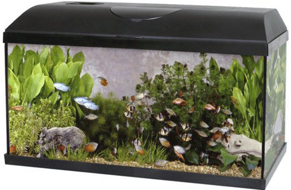 Set je opatřen plastovým krytem, který má ve vrchní části otevíratelnou klapnu k pohodlnému krmení rybiček. Horní hrany akvária jsou krytem chráněny proti poškození.