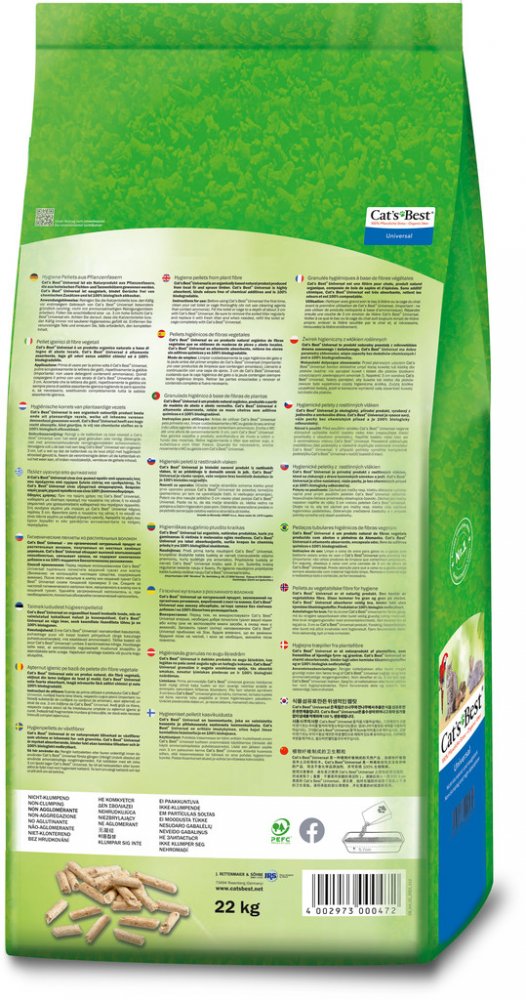 Podestýlka Cat's Best Universal je složena z peletek z dřevní vlákniny, která je vhodná především pro drobné savce, kočky a ptáky. Jde o čistě přírodní produkt, který je neparfémovaný, dobře pohlcuje zápach a zároveň má vysokou absorpční schopnost. Použít ji lze jak samostatně, tak v kombinaci s jinými materiály.
