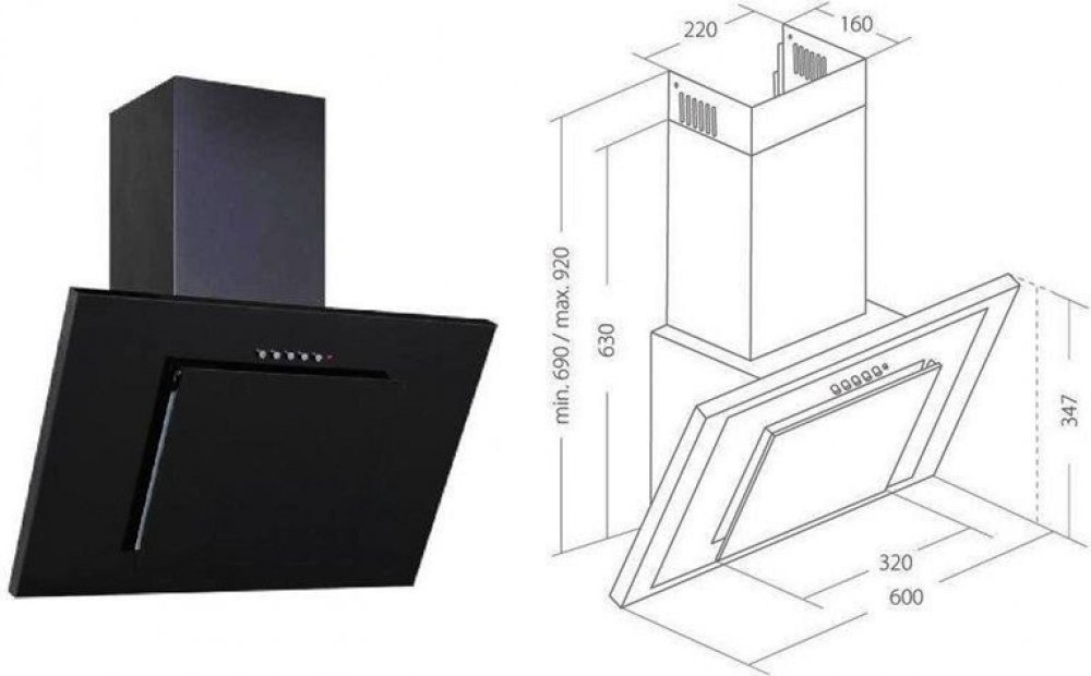 \* Upřesnění: Korpus a velký šikmý panel je z černě lakovaného plechu / Středový (menší) panel je z černého skla