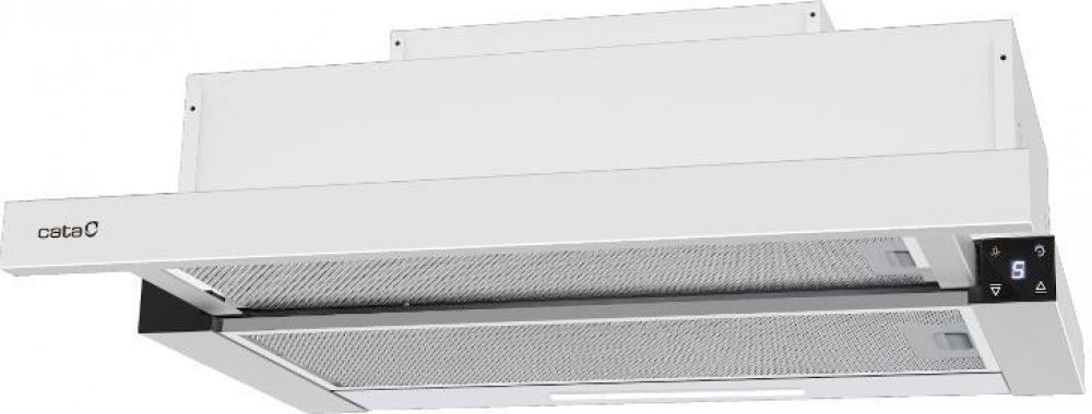 Vestavná výsuvná digestoř s bezkartáčovým motorem: šíře 600 mm, bílá, 1 motor T1DC 90 W, 5 rychlostí + TURBO, 575 m3/h (5 Pa), max. tlak 300 Pa, max. hlučnost Lw 63 dB.