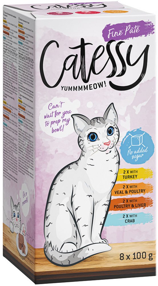 Upozornění: Během přechodné doby může Vaše objednávka obsahovat produkty v novém i ve starém designu. Design nemá vliv na obsah a složení. Co již lepšího může být, než Vaši kočku s každým krmením nejen vyváženě vyživovat, ale i rozmazlovat její chuťové buňky? Krmivo Catessy obsahuje aromatické přísady a tím je mimořádně lahodné. Zásobí Vaši kočku vitamíny a minerálními látkami, které jsou zapoz´třebí pro aktivní a zdravý život. Mističky Catessy jsou bez přídavku cukru a Made in Germany. Následující chutné varianty má Váš miláček na výběr - nyní v praktickém namíchaném balení pro ještě více pestrosti: 2 misky s drůbežím játry: extra lehké, s důležitými vitamíny a minerálními látkami 2 misky s telecím drůbežím: jemné a křehké, s důležitými vitamíny a minerálními látkami 2 misky s kraby: jemné a zdravé mořské delikatesy, s důležitými vitamíny a minerálními látkami 2 misky s krůtím: lehké a dobře stravitelné, s důležitými vitamíny a minerálními látkami Rozmazlujte Vaši kočku při každém krmení! Catessy – pohlazení pro Vaši kočku!