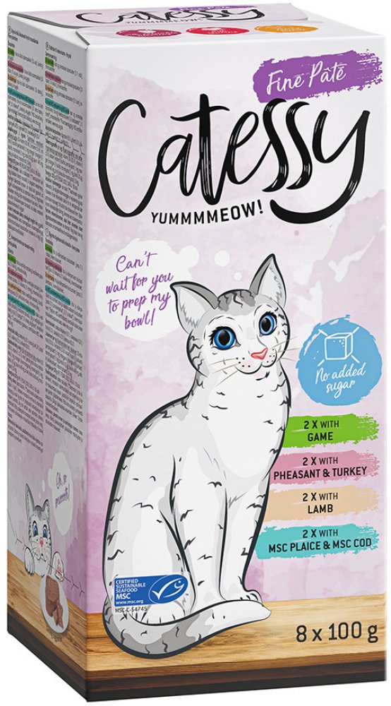 Paštiky Catessy jsou super křehké a neuvěřitelně šťavnaté. Kousky v omáčce jsou super šťavnaté a neodolatelné. Ať už se jedná o drůbeží, kraby, hovězí, jehněčí, ryby nebo zvěřinu - to je krmivo pro labužníky mezi kočkami. Lahůdka, která je tak lehká a snadno stravitelná, že je miska brzy prázdná. A co je nejlepší, naše misky neobsahují žádný přidaný cukr, barviva ani konzervační látky. Na druhou stranu jsou bohaté na cenné vitamíny a taurin. Zůstává jen chuť: Jednoduše vynikající! Následující míchaná balení zajišťují rozmanitost v misce: Jemný mix paštik I: 8 vaniček s drůbežím a játry 8 vaniček s telecím a drůbežím 8 vaniček s kraby 8 vaniček s krůtím Jemný mix paštik II: 8 vaniček se zvěřinou 8 vaniček s bažantím a krůtím 8 vaniček s jehněčím 8 vaniček s MSC platýsem a MSC treskou Kousky v omáčce mix: 8 vaniček s hovězím 8 vaniček s kuřecím 8 vaniček s MSC treskou tmavou 8 vaniček s MSC treskou obecnou Nyní trvale levné a chutné! Catessy - stejně důležité jako mazlení!