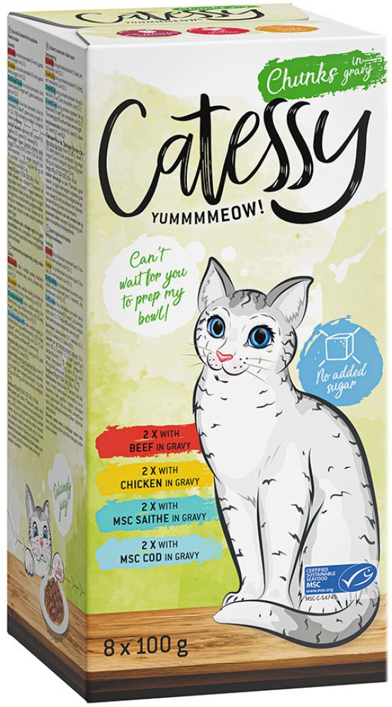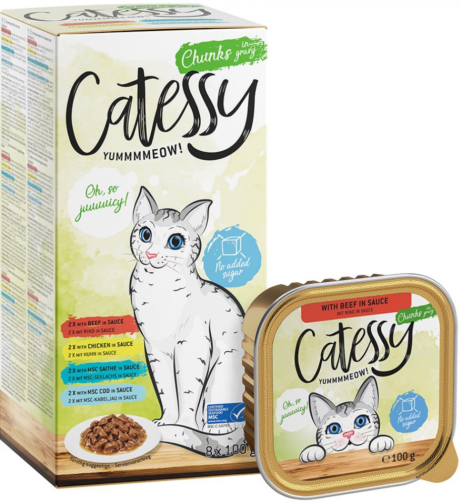 Paštiky Catessy jsou super křehké a neuvěřitelně šťavnaté. Kousky v omáčce jsou super šťavnaté a neodolatelné. Ať už se jedná o drůbeží, kraby, hovězí, jehněčí, ryby nebo zvěřinu - to je krmivo pro labužníky mezi kočkami. Lahůdka, která je tak lehká a snadno stravitelná, že je miska brzy prázdná. A co je nejlepší, naše misky neobsahují žádný přidaný cukr, barviva ani konzervační látky. Na druhou stranu jsou bohaté na cenné vitamíny a taurin. Zůstává jen chuť: Jednoduše vynikající! Následující míchaná balení zajišťují rozmanitost v misce: Jemný mix paštik I: 2 vaničky s drůbežím a játry 2 vaničky s telecím a drůbežím 2 vaničky s kraby 2 vaničky s krůtím Jemný mix paštik II: 2 vaničky se zvěřinou 2 vaničky s bažantím a krůtím 2 vaničky s jehněčím 2 vaničky s MSC platýsem a MSC treskou Kousky v omáčce mix: 2 vaničky s hovězím 2 vaničky s kuřecím 2 vaničky s MSC treskou tmavou 2 vaničky s MSC treskou obecnou Nyní trvale levné a chutné! Catessy - stejně důležité jako mazlení!