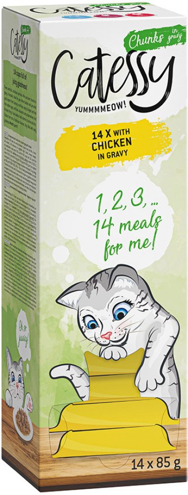 Šetření se tak stane zábavou i pro vaši kočku! Catessy vaši kočku rozmazluje šťavnatými masovými a rybími kousky v omáčce. Různé varianty nabízejí vše, co vy i vaše kočka od Catessy očekáváte: všechny důležité vitamíny a živiny taurin pro podporu silného srdce zinek pro podporu imunitního systému bez cukru bez umělých barviv a konzervačních látek vlhké krmivo vyrobené v Evropě Praktické mističky o hmotnosti 85 g zaručují svěží a aromatickou chuť každého jídla a také snadné a čisté porcování. Spokojené předení zaručeno! Vyberte si z následujících lahodných příchutí: kousky v omáčce s kuřecím (s přidaným inulinem pro extra podporu trávení) kousky v omáčce with atlantickým lososem (přirozeně bohaté na omega-3 mastné kyseliny) kousky v omáčce s hovězím kousky v omáčce s játry a srdíčky Catessy - Purr with Happiness!