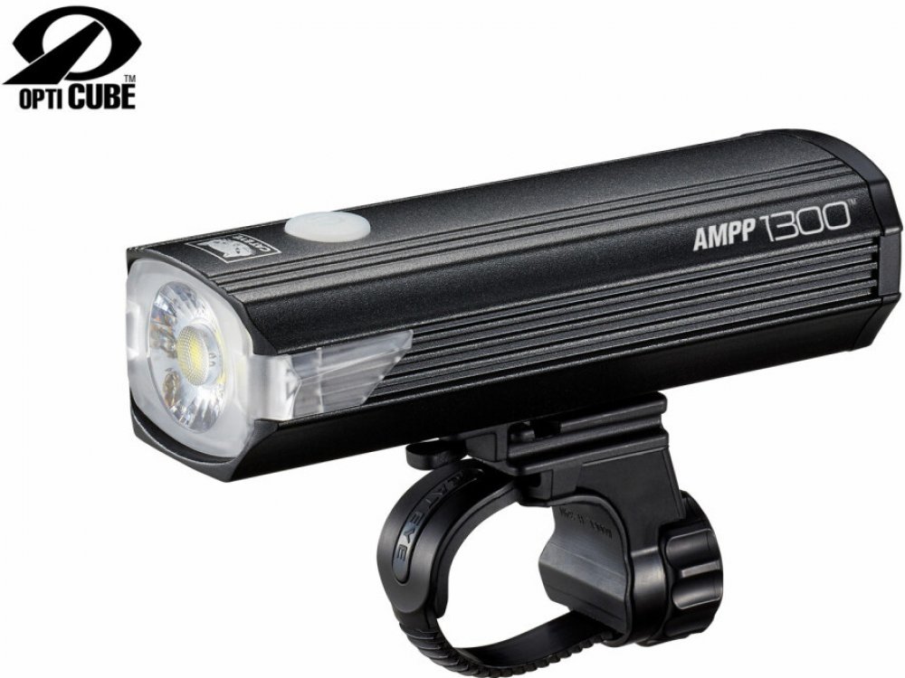 Přední dobíjecí extra výkonné (1300lm) světlo CATEYE AMPP1300 s Alu tělem a s technologií OptiCube (speciální konstrukce optických čoček usměrňující tok světla pro lepší osvícení vozovky). Indikátor kapacity akumulátoru a dobíjení integrovaný do vypínače. Hmotnost s držákem 240 g.