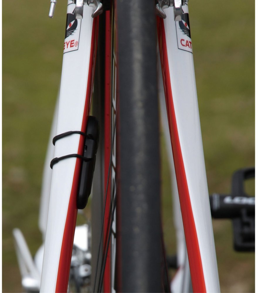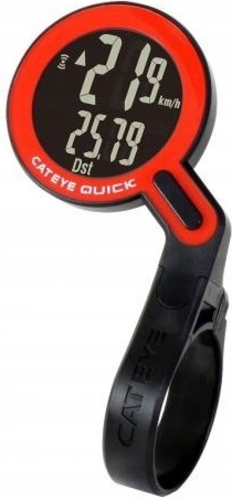 Tenký bezdrátový/beztlačítkový cyklopočítač CATEYE malých rozměrů s velkým displejem a číslicemi. Tenký snímač rychlosti SPD-02 určený pro kola se vzdáleností mezi drátem a vidlicí 12-17mm. 8 funkcí: denní (1 a 2) / celková vzdálenost, okamžitá / průměrná / max. rychlost, čas jízdy, hodiny, funkce Pacer - indikátor (šipky) poměřující okamžitou a průměrnou rychlost, nastavitelné dva průměry kola a celková vzdálenost, aut. funkce START / STOP, bezdrátový přenos na vzdálenost až 60cm, otočný držák "Flex-Tight" s univerzální objímkou umožňující připevnění na všechny průměry řídítek nebo představců, k montáži držáku a snímače není potřeba žádné nářadí.