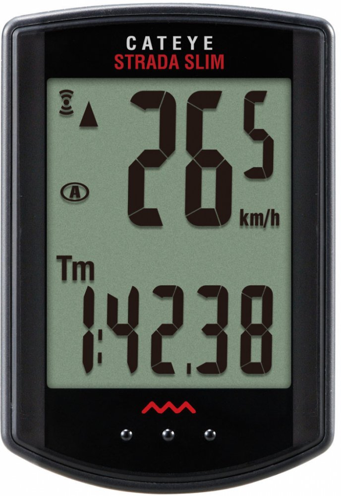 Tenký bezdrátový/beztlačítkový cyklopočítač CATEYE malých rozměrů s velkým displejem a číslicemi. Tenký snímač rychlosti SPD-02 určený pro kola se vzdáleností mezi drátem a vidlicí 12-17mm.