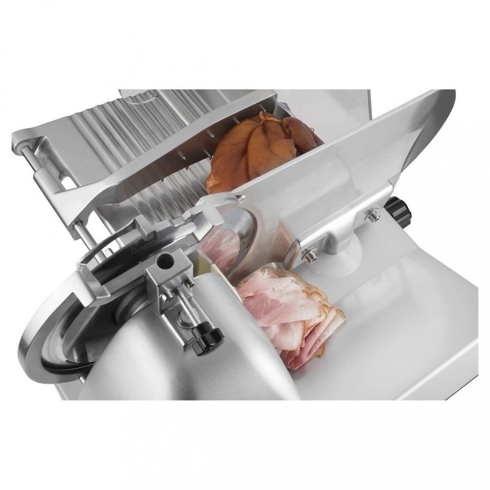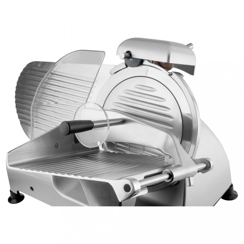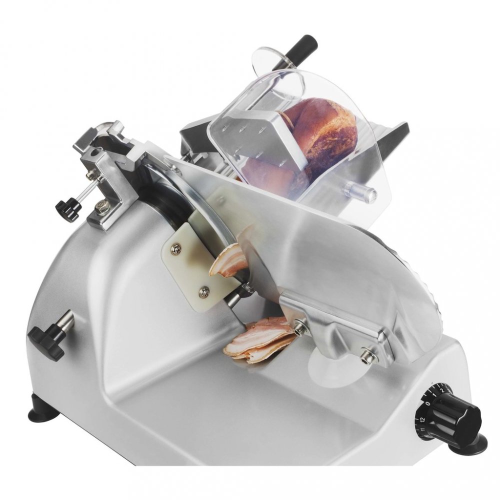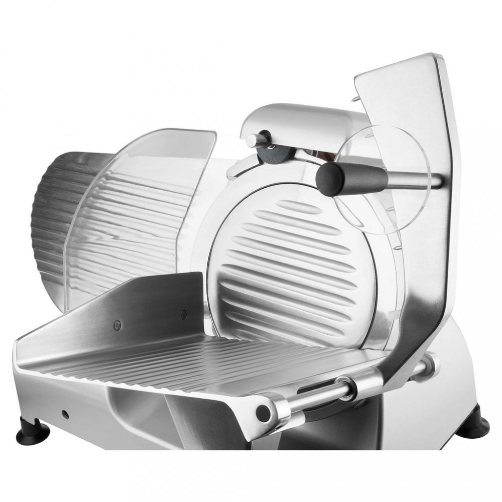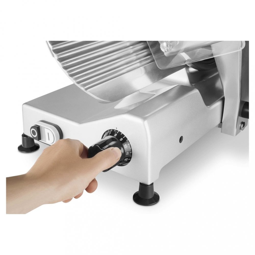 Profesionální elektrický kráječ vhodný pro domácí i komerční využití. Díky robustní kovové konstrukci a výkonnému motoru zvládne precizně nakrájet jak měkké, tak i tvrdé potraviny.