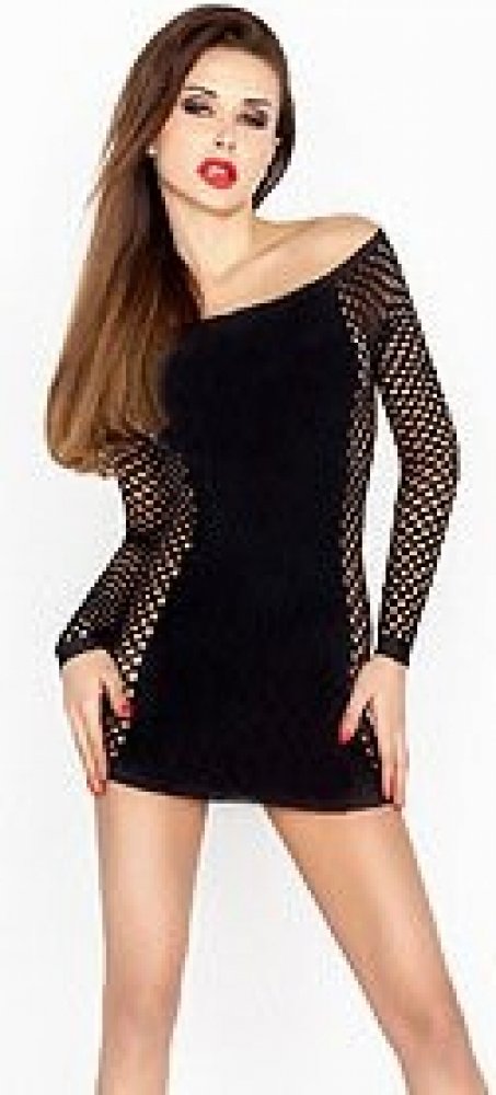 Černé šaty Passion krátkého střihu a dlouhým rukávem šité z pružné síťoviny. Střední část je neprůhledná, boky a rukávy jsou ze síťoviny s velkými oky, ve kterých budete neodolatelná a velmi žádoucí. Tyto černé šaty jsou ušity z elastického materiálu, který perfektně vytvaruje vaše ženské křivky. Střední část šatů je neprůhledná, boky a rukávy jsou ze síťoviny s velkými oky.
