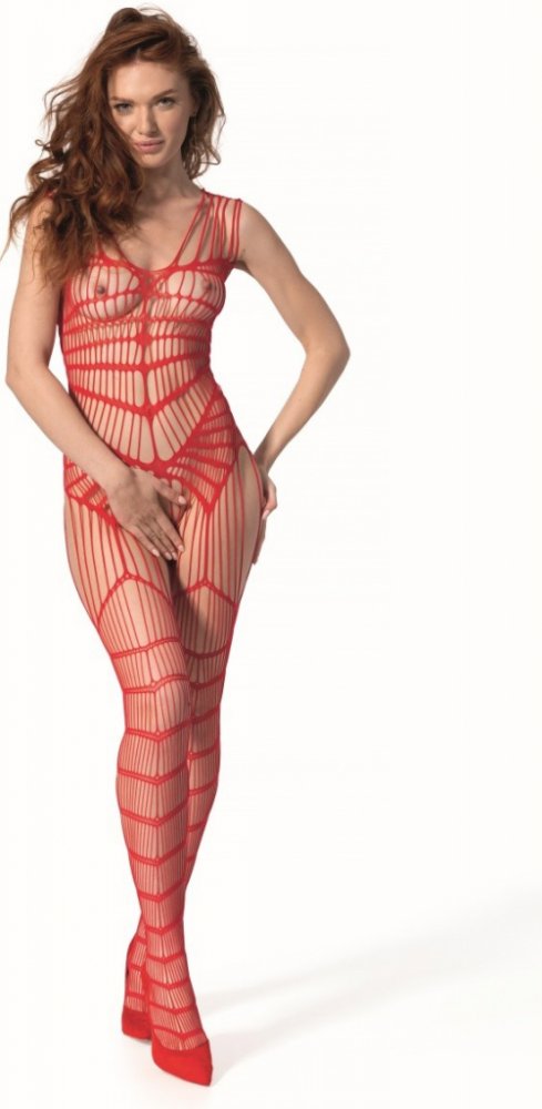 Tento vysoce přitažlivý catsuit sexy červené barvy podtrhne váš sex-appeal a podpoří vášnivou atmosféru. Je ušit z hedvábně jemné tkaniny, která je mimořádně pružná, takže se skvěle přizpůsobí vašim křivkám, zdůrazní vaši krásu a zajistí maximální pohodlí při nošení. Přiznané linie oblečku napodobují vzhled ramínkového korzetu s podvazky a punčochami, které tvoří fascinující geometrické obrazce síťoviny z velkých oček. Rozhodně zanechá silný dojem, který nelze přehlédnout a vaše drahá polovička tak získá snadný přístup pro něžné doteky.