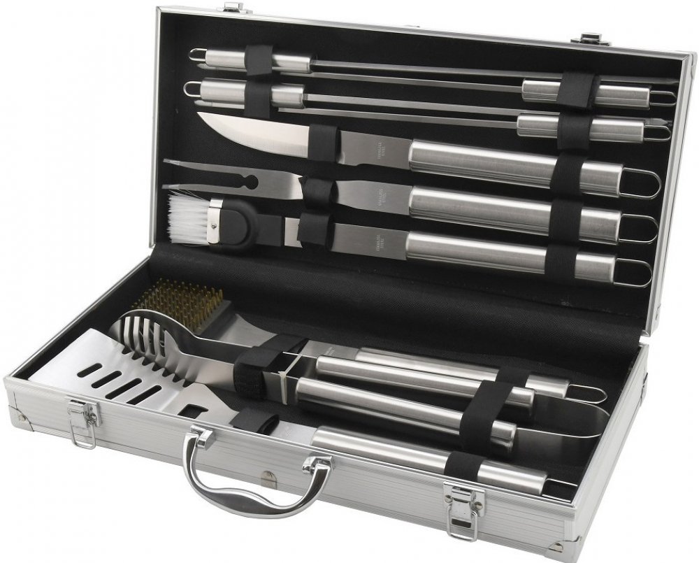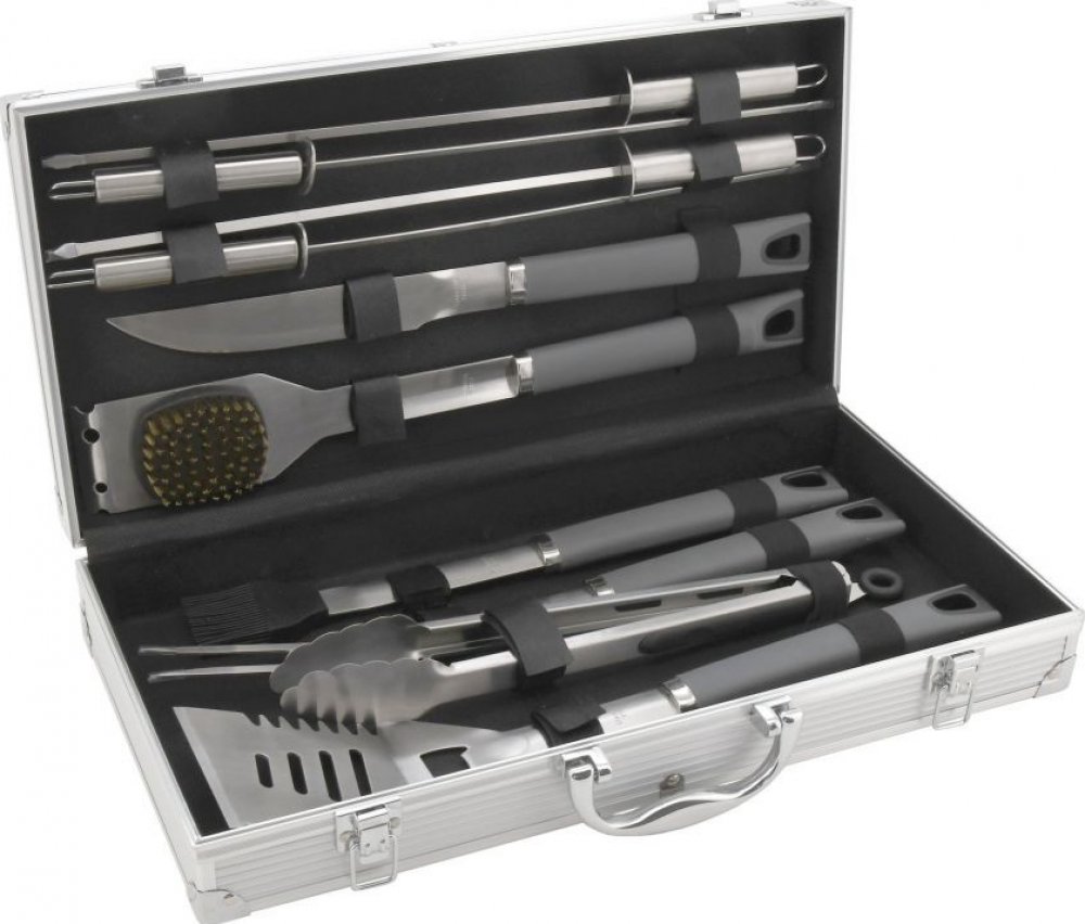 V sadě se nachází obracečka s precizně zabroušenou hranou vybavená zoubkovaným ostřím, otvírákem zátek a otvory pro odtok. Kleště, speciálně tvarované pro jistý úchop nejrůznějších pokrmů, kartáč pro údržbu grilu, kdy samotná kartáčová část je z mosazi. Nepostradatelnou částí grilovacího nářadí je i dvouzubá vidlička, štětec se štětinami z nylonu, pro potírání, či mašlování pokrmů, porcovací nůž a 4x grilovací jehlice s hroty broušenými do špičky. Veškeré nářadí není nijak zbytečně tvarováno, což významně usnadňuje čištění. Grilovací nářadí je navíc doplěné o pohodlné silikonové rukojeti a veškeré nástroje lze pověsit za háčky. Sada je úhledně umístěna v transportním kufru, hodí se zejména u náročnějších uživatelů, její přehlednost a výčet jednotlivých nástrojů však ocení kdokoliv.Technické údaje: rozměr sady: 44 x 24 x 8,5 cmsada: 11 kspouzdro: aluminiový kufříkmateriál: nerezová ocel, silikonová rukojeťObsah balení: 1 x sada grilovacího nářadí