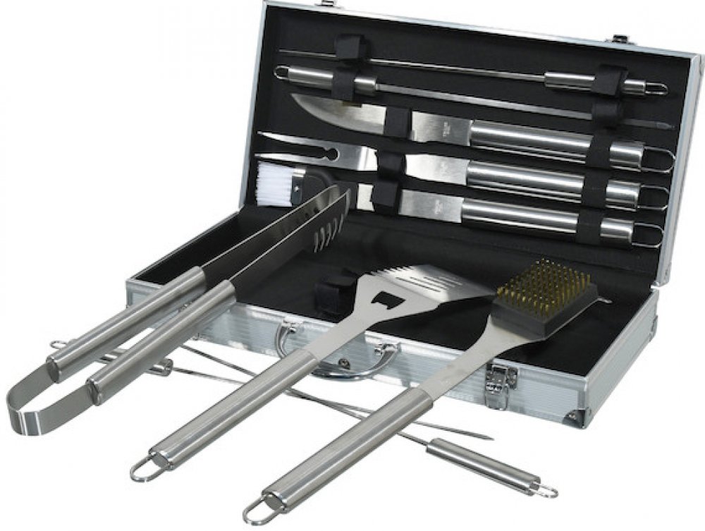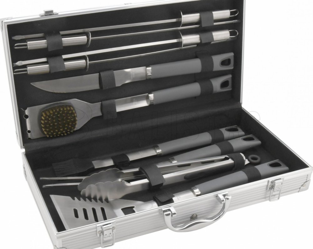 V sadě se nachází obracečka s precizně zabroušenou hranou vybavená zoubkovaným ostřím, otvírákem zátek a otvory pro odtok. Kleště, speciálně tvarované pro jistý úchop nejrůznějších pokrmů, kartáč pro údržbu grilu, kdy samotná kartáčová část je z mosazi. Nepostradatelnou částí grilovacího nářadí je i dvouzubá vidlička, štětec se štětinami z nylonu, pro potírání, či mašlování pokrmů, porcovací nůž a...