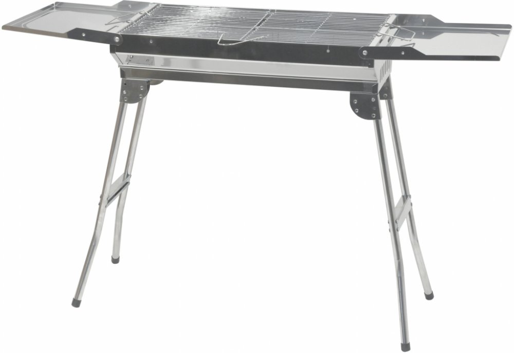 Konstrukce je vyrobena z kvalitní nerezové oceli s lesklým povrchem. Stabilitu zajišťují vyklápěcí nohy. Rozměry grilu 112 x 30 x 71 cm.