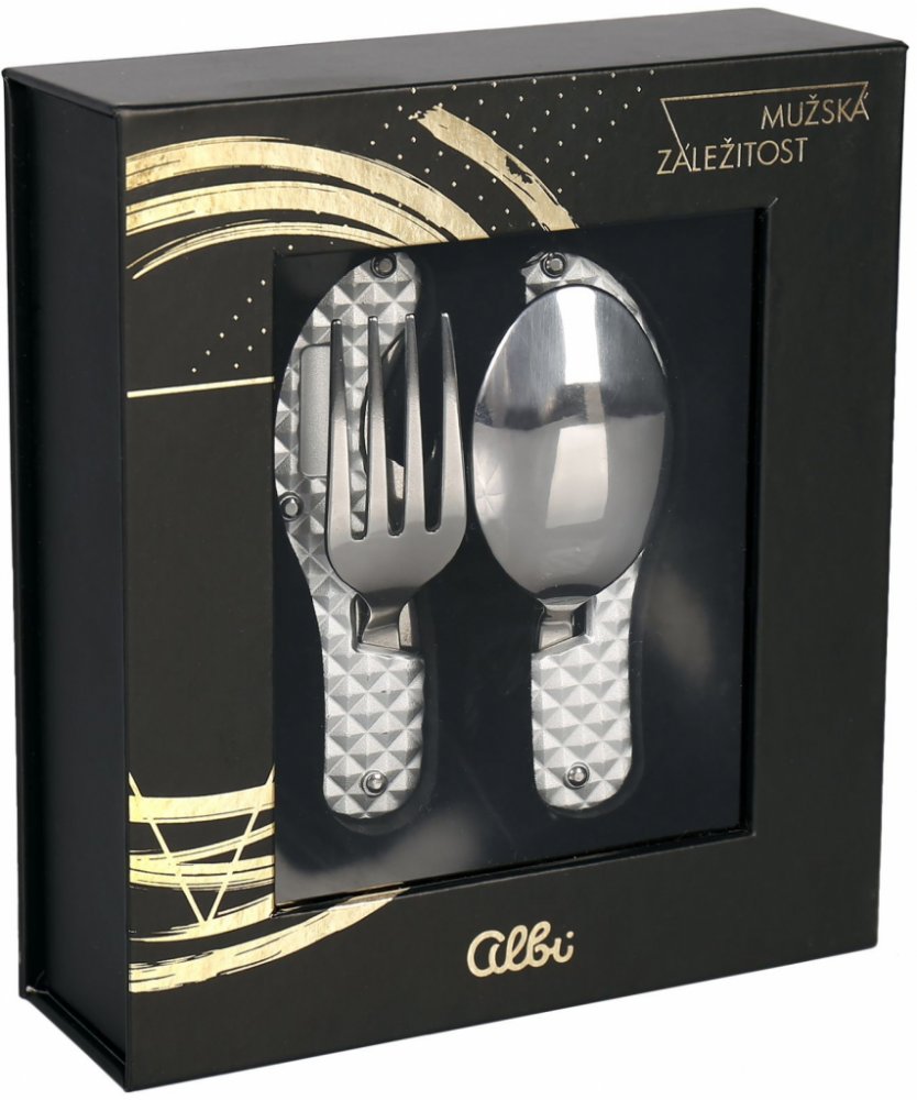 • Sada se skládá ze lžíce, nože a vidličky délky 16 cm s celkovou hmotností 80g, uložených v textilním pouzdře s rozměry 8 x 12 x 3 cm.