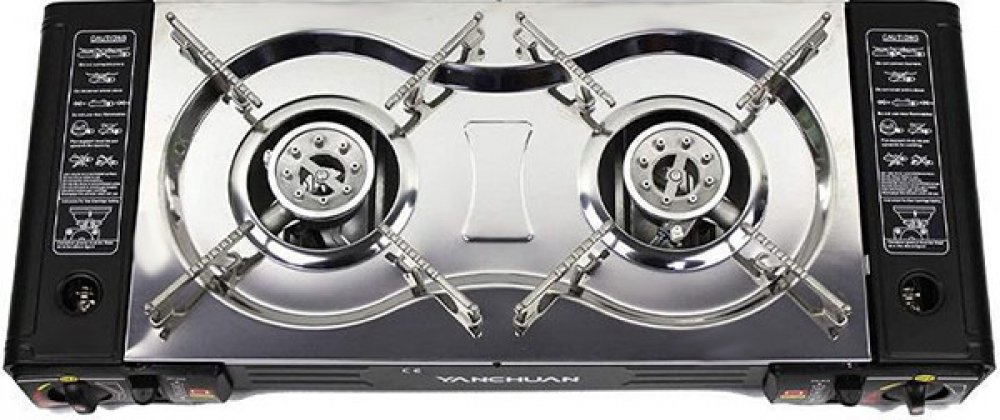 Outdoorový cestovní vařič se dvěma hořáky na propan-butan, pro ohřívání a přípravu pokrmů na cestách, v kempu apod.