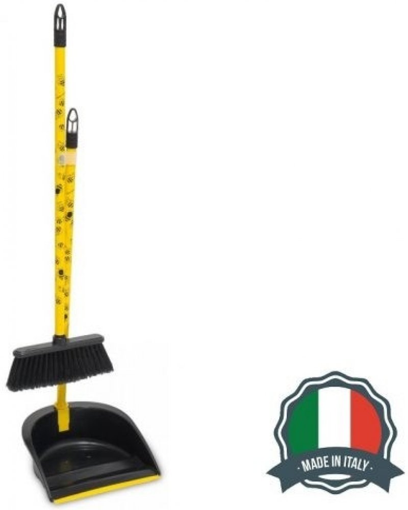 Set obsahuje smeták s násadou a lopatku s násadou. Smeták má plastové těleso, syntetická vlákna a hůl dlouhou 120 cm s plastovým povlakem. Smetáček s plastovým tělesem je osazen syntetickými vlákny, plastová lopatka má gumovou lištu. Vyrobeno v Itálii.