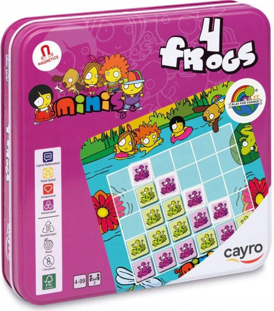 Magnetická hra ideální pro zábavu na cestách a nejen tam. Pokud chcete zabavit své ratolesti např. při čekání u lékaře, v dopravním prostředku nebo jen tak. Hra je magnetická a skladná. Nic neupadne a neztratí se ani při drncavé jízdě. Vyberte si barvu žab a pokuste se je umístit do mřížky podle pravidel tak, abyste jako první vytvořili souvislou řadu se 4 žabkami. Obsah balení: 1 hrací plocha 190 x 190 mm 30 hracích žetonů ve 2 barvách 20 x 20 x 2 mm