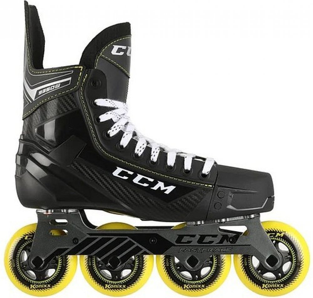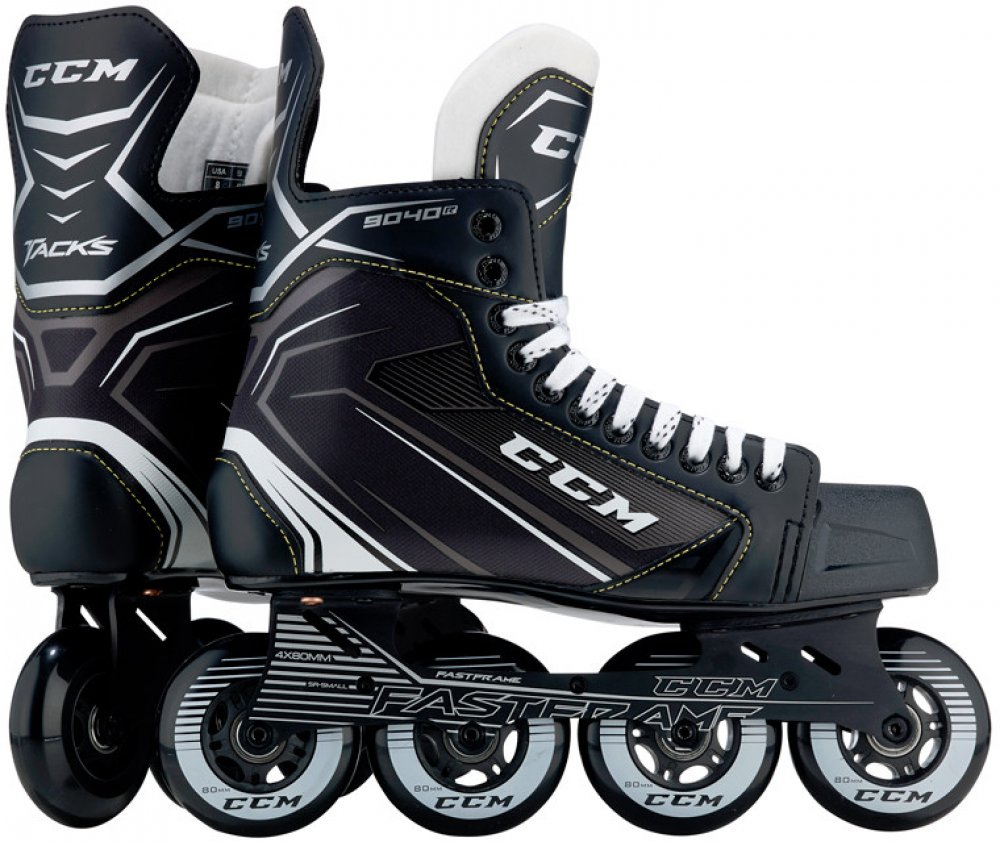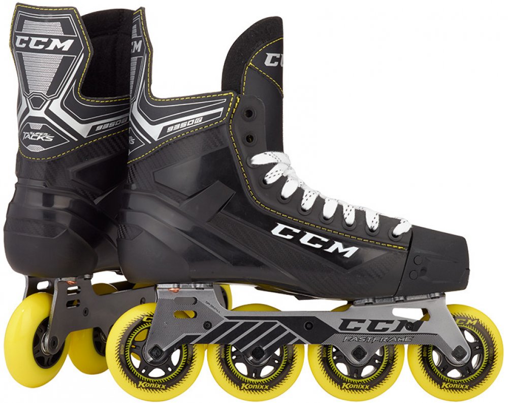 Atraktivní kolečkové brusle CCM Super Tacks RH9350 určené na in-line hokej a bruslení. Základní model kolečkových bruslí světové značky CCM. Anatomicky perfektně tvarovaná bota zaručuje dokonalé pohodlí při hře. Bota brusle s moderní jednodílnou konstrukcí zabezpečuje výbornou oporu pro nohu a je velmi pohodlná, odolná kolečka CCM KONIXX s tvrdostí 82A jsou optimální pro vnější hladké povrchy, jako je asfalt, beton atd. Komfortní a odolná bota brusle je vyrobená technologií 3D vstřikování (3D injected boot). Díky nové konstrukci je brusle odolnější, poskytuje novou úroveň pohodlí a přizpůsobení. Vynikající rychleschnoucí mikrovláknová podšívka, plstěný 7 mm jazyk pro zabezpečení výborné opory a ochrany nártu. Plastová špice pro ochranu před úderem in-line puku, kvalitní velmi lehká plastová podrážka. Lehký a stabilní dvojdílný ALU podvozek - šasi CCM FastFrame. Kvalitní kolečka CCM KONIXX, všechna čtyři s tvrdostí 82A. Průměr koleček je u všech 4 koleček stejný a to pro velikosti 1,2 a 3 je průměr 72 mm, pro velikost 4 a 5 je průměr 76 mm, pro velikost 6 a více je průměr 80 mm. Jsou použita kvalitní ložiska RIZON ABEC 5.