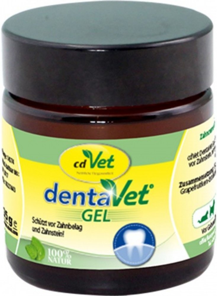 Přírodní dentální gel z bylinných olejů a abraziv pro komplexní účinnou péči o zuby, dásně a mikroflóru dutiny ústní. „DentaVet Gel na zuby a dásně“ pomáhá také při zápachu z úst a čistí zuby od zubního plaku pomocí přírodního abraziva (moučka z vaječných skořápek). Šetrně odstraňuje zubní kámen bez poškození zubní skloviny. Přírodní minerální hornina zeolit zároveň váže toxiny a plísně a tím harmonizuje mikroflóru dutiny ústní. Díky mastné olejové konsistenci ulpívá gel na zubech a dásních déle než běžné zubní pasty a tak mohou pečujících látek z bylin déle působit. Při zánětu dásní doporučujeme kombinovat s olejem DentaVet. Výrobce cdVet.de - Německo.